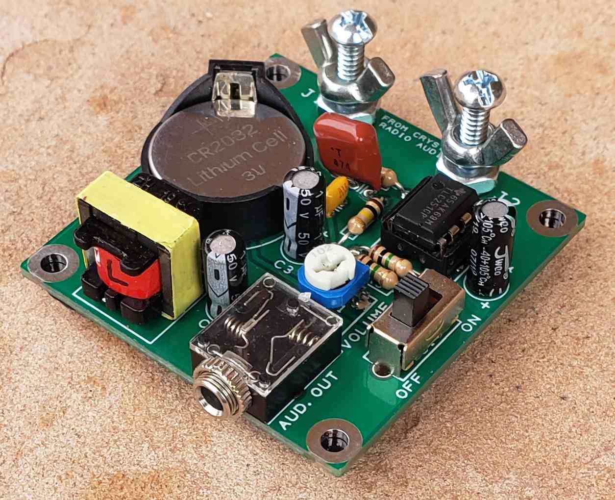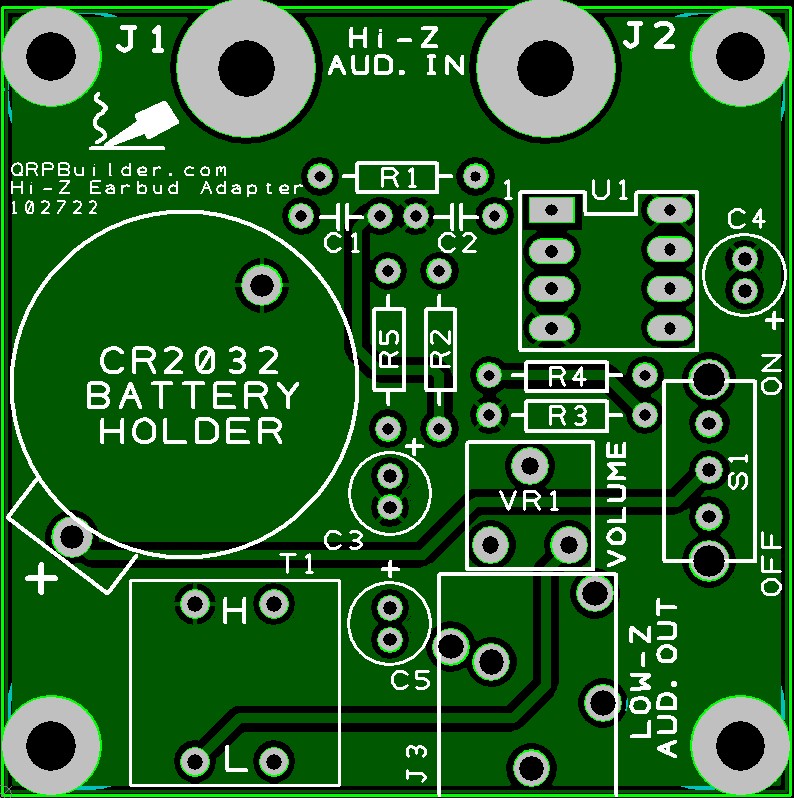 Crystal Radio Hi-Z to Low-Z Earbud Adapter [Show thumbnails] Hi-Z Earbud Adapter Kit – $20 The #1 hardest and usually the most costly item to obtain in making a successful crystal radio for maximum performance, is a good set of sensitive high impedance headphones. This kit allows the use of common low impedance earbuds (like Walkman style) to work with high impedance audio output circuits found on crystal radios, without loading down the circuit resulting in loss of sensitivity or selectivity. Just plug in your inexpensive 3.5mm earbuds into the pcb and attach two wires from the adapter binding posts to the headphone connections of your radio. You will be amazed at the tonal quality and bass response. It is similar to the HZX Headphone Adapter featured in the article by the ARRL, but runs on a CR2032 coin battery, uses a common LM741, and has adjustable gain. It can be easily moved from radio to radio. A long battery life, due to the very low current draw of the circuit. The pcb is just 2″ x 2 1/8″. The tools required for the kit are a soldering iron with a small tip, rosin core solder, small side cutters, and can be built in less than an hour, depending on your experience. On a difficulty scale of 1 to 5, 5 being the most difficult, this is rated at 2. Click here for the assembly details. Click here for the original ARRL HZX Headphone Adapter article. [Show thumbnails]