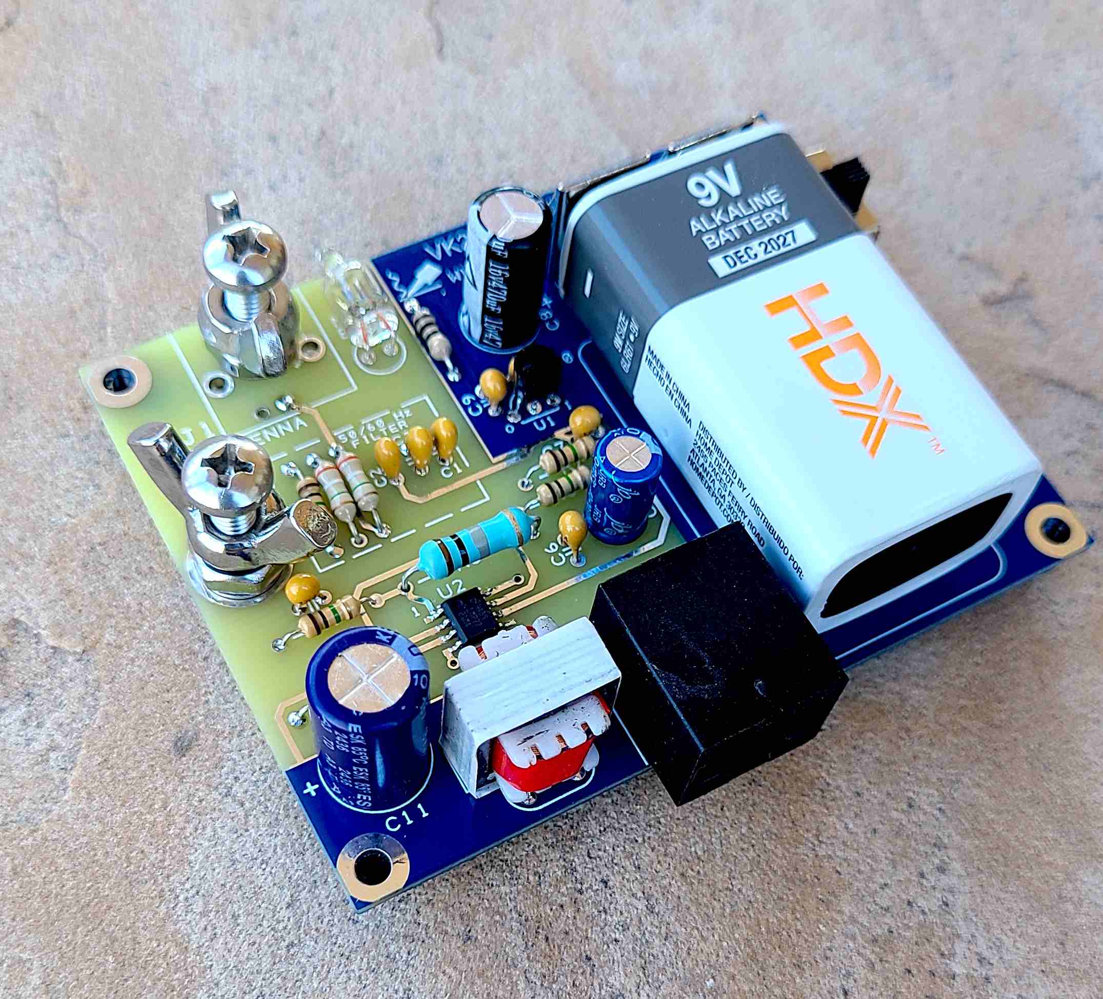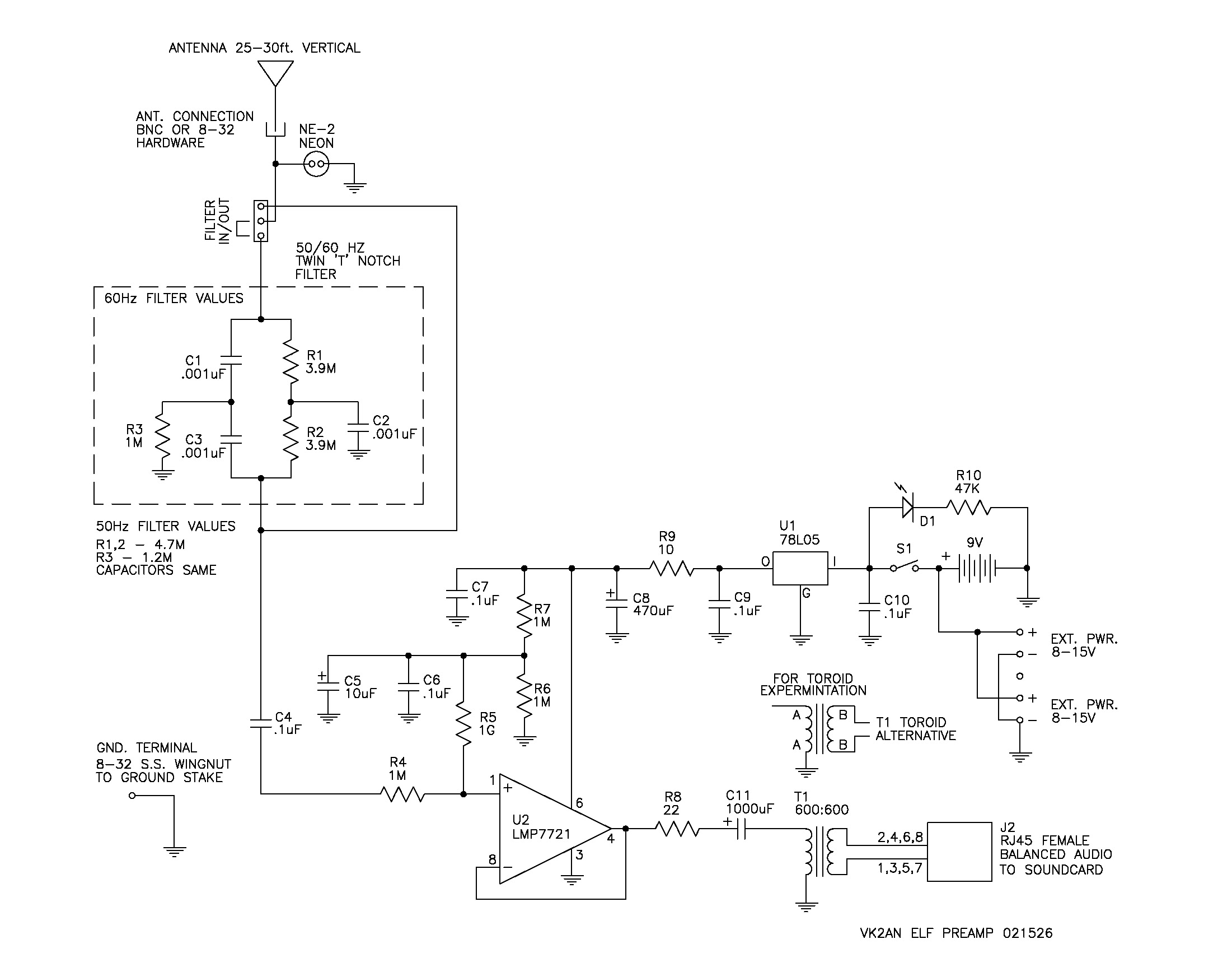 This board is basically Peter’s posted circuit, with an 50/60Hz Twin “T” notch filter to filter out domestic supply interference, between the antenna, and his circuit that can be optimized for 60Hz or 50Hz, depending on your local supply frequency. The filter can be bypassed if desired. The pre-amp can be used portable with the 9V battery or hard wired in a remote installation. The balanced audio output is via an RJ54 connector for a cat5 run to your sound card.
