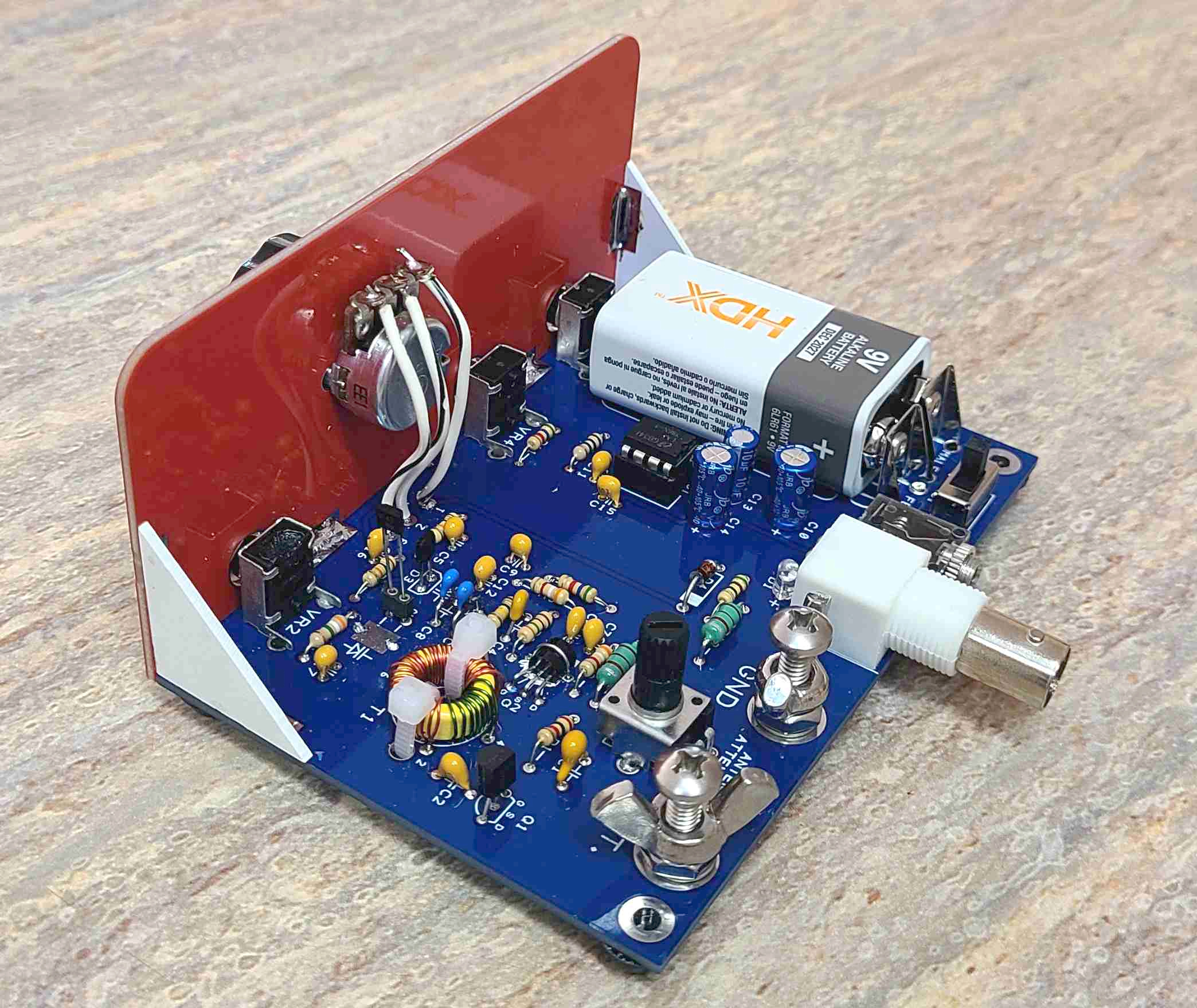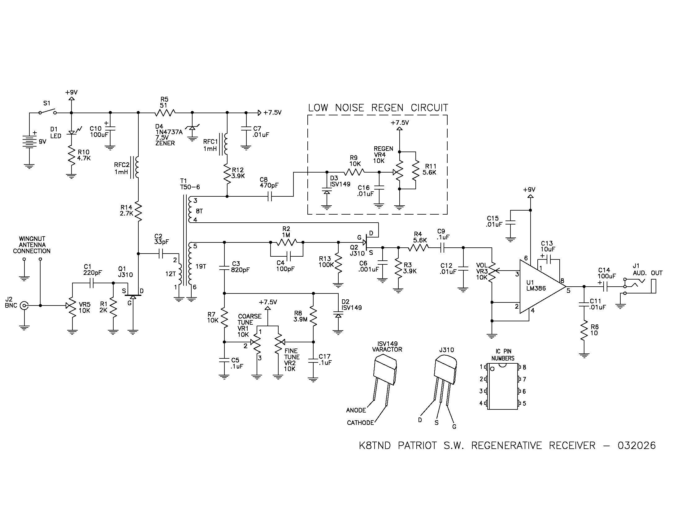 Cliff Donley (K8TND) has revisited the basic Charles Kitchin (N1TEV) circuit, and heavily modified it, incorporating an JFET front end, varactor tuning, toroid inductor, new low noise regeneration, while still making it easy to build. We integrated Cliff’s design into a compact pcb chassis and with controls for Coarse Tuning, Fine Tuning, Regeneration control, Volume, and Antenna Attenuator.