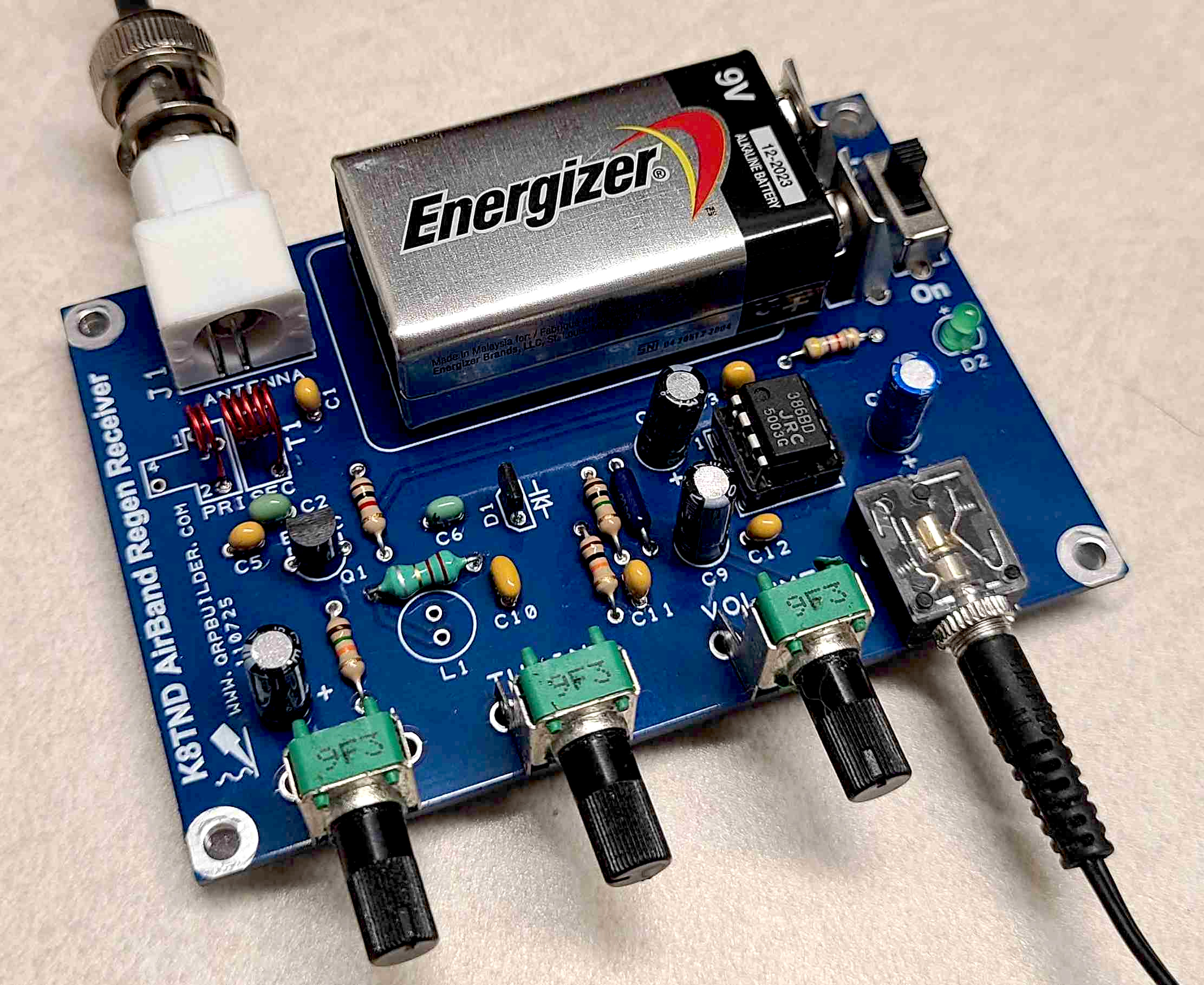 Ever wonder what those airplanes in the sky are really saying to the control tower and to each other? Well now you can find out with the compact K8TND VHF Receiver for the 108-136MHz AM VHF band, or the 6m amateur band. Listen to the sample .mp3 file below. To keep it as simple and inexpensive as possible, a sensitive regenerative circuit is used, which will easily pick up the radio transmissions from aircraft and nearby ground controllers. All you need in addition is a pair of headphones or earbuds, simple antenna, and a 9V battery. Board size is 3.50″ x 2.50″, and the current drain on a 9 volt battery is less than 10mA, so you will have many hours of listening fun on a single battery.